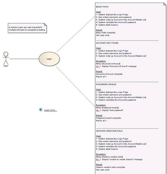 As you can see, even a simple Login use case can have quite a bit of behavior associated with it. In many organizations these scenarios will be tested by a QA organization, but there’s nothing to stop developers from scenario-testing their own code if they want to. Regardless of who does the testing, it’s important that all the threads get tested.