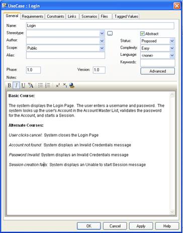 There’s plenty of detail on how to write good “ICONIX style” narrative use cases in Use Case Driven Object Modeling – Theory and Practice, but for now we’ll just assume we have one, and present it here in Figure 3. You’ll notice that we wrote our original narrative use case in the “General” tab of the use case specification dialog.