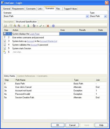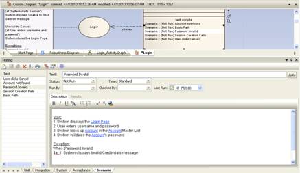 We’ll skip over the ICONIX Process analysis, design, and coding activities[6] for our Login use case for the purposes of this article, and get directly to the point where we’d like to define scenario tests so that our QA department can independently verify that the developers have implemented Login correctly. To do this we’ll convert our narrative use case to a structured scenario. Without going into all the details, the result should look like Figure 4 (note that we’re now using the Scenarios tab of the use case spec).
