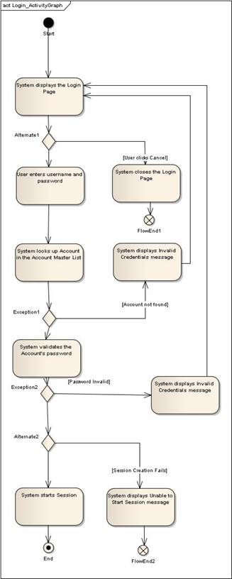 Figure 5 shows an activity diagram we’ve generated for Login. Our experience has shown that checking your structured scenario in this manner leads to better results in test case generation, as the test scenarios won’t generate correctly if the path logic is wrong.